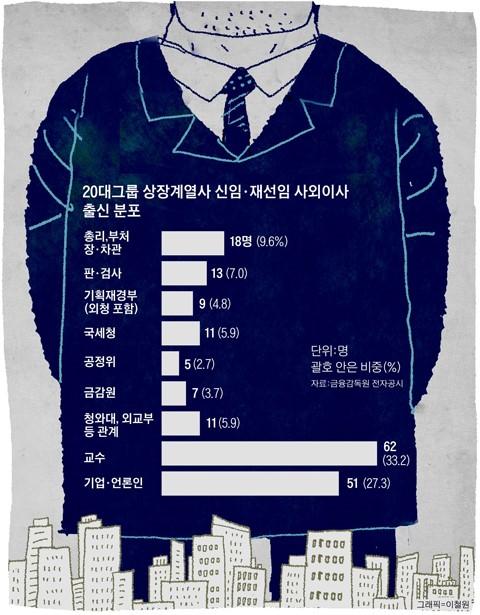 ​10. 20대 그룹 사외이사 10명 중 4명 권력기관 출신 → 187명 중 74명이 고위 관료, 법원·검찰, 청와대 등 소위 '권력기관' 출신... 단일 직군으로는 교수가 최다 33%.(조선)▼