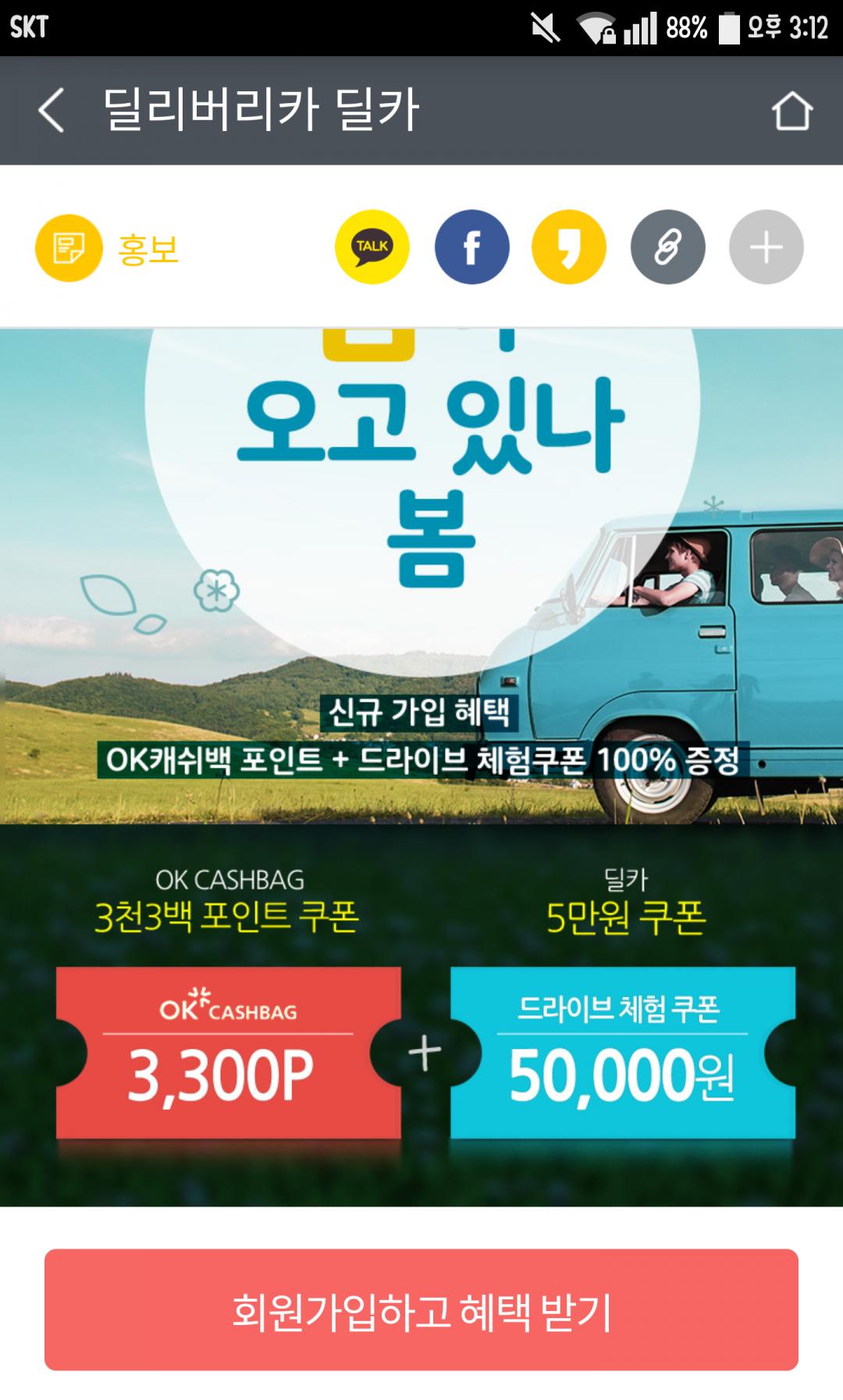 저는 ok캐쉬백 재가입을 위해 탈퇴해둔 상태라 검증 못했어요. 어플 실행하면 메인에 딜카 신규가입 이벤트 뜨네요.
