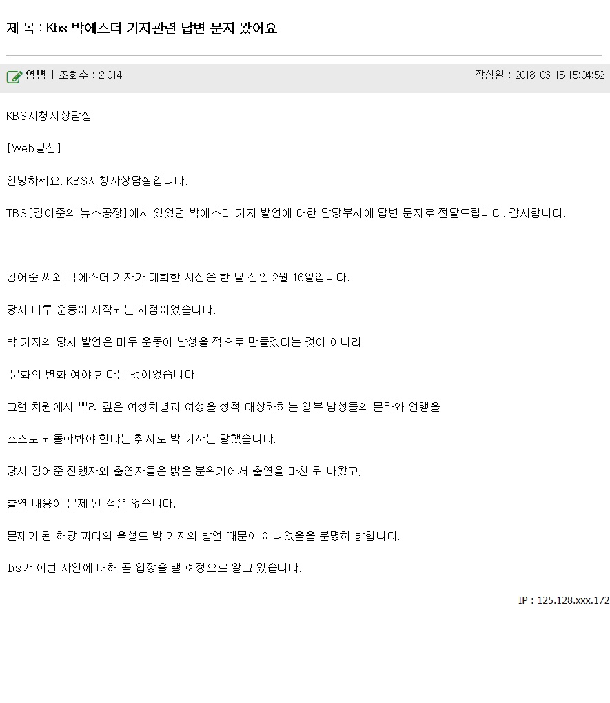 Kbs 박에스더 기자관련 답변 문자 왔어요(펌) > 자유게시판