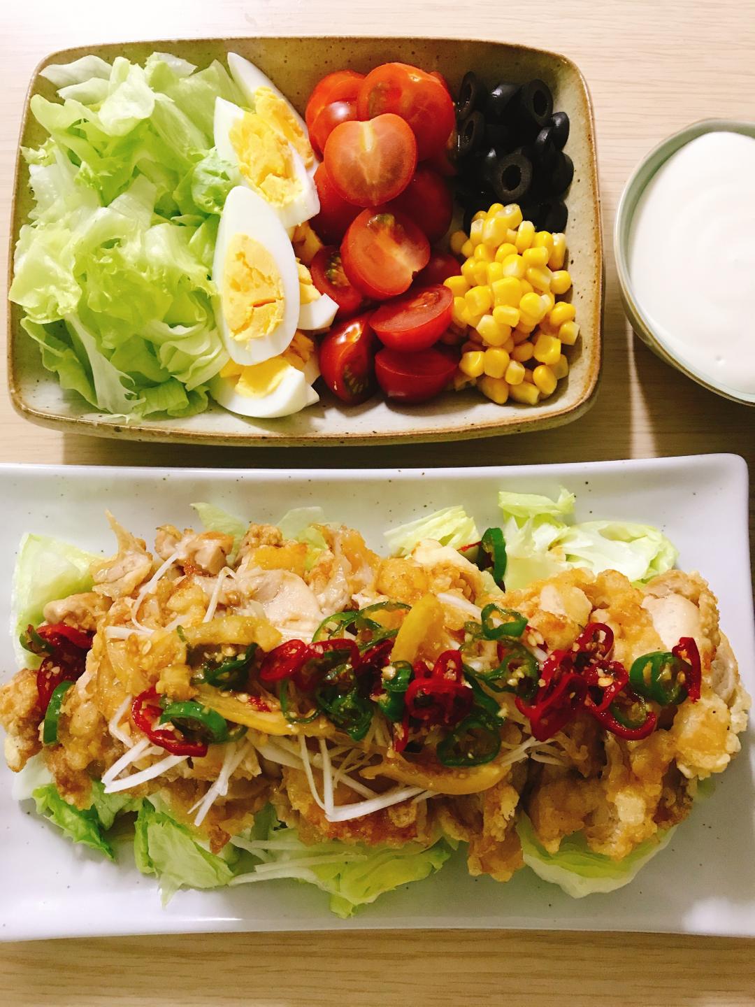 해물백짬뽕 과, 유린기, 콥샐러드 입니다.