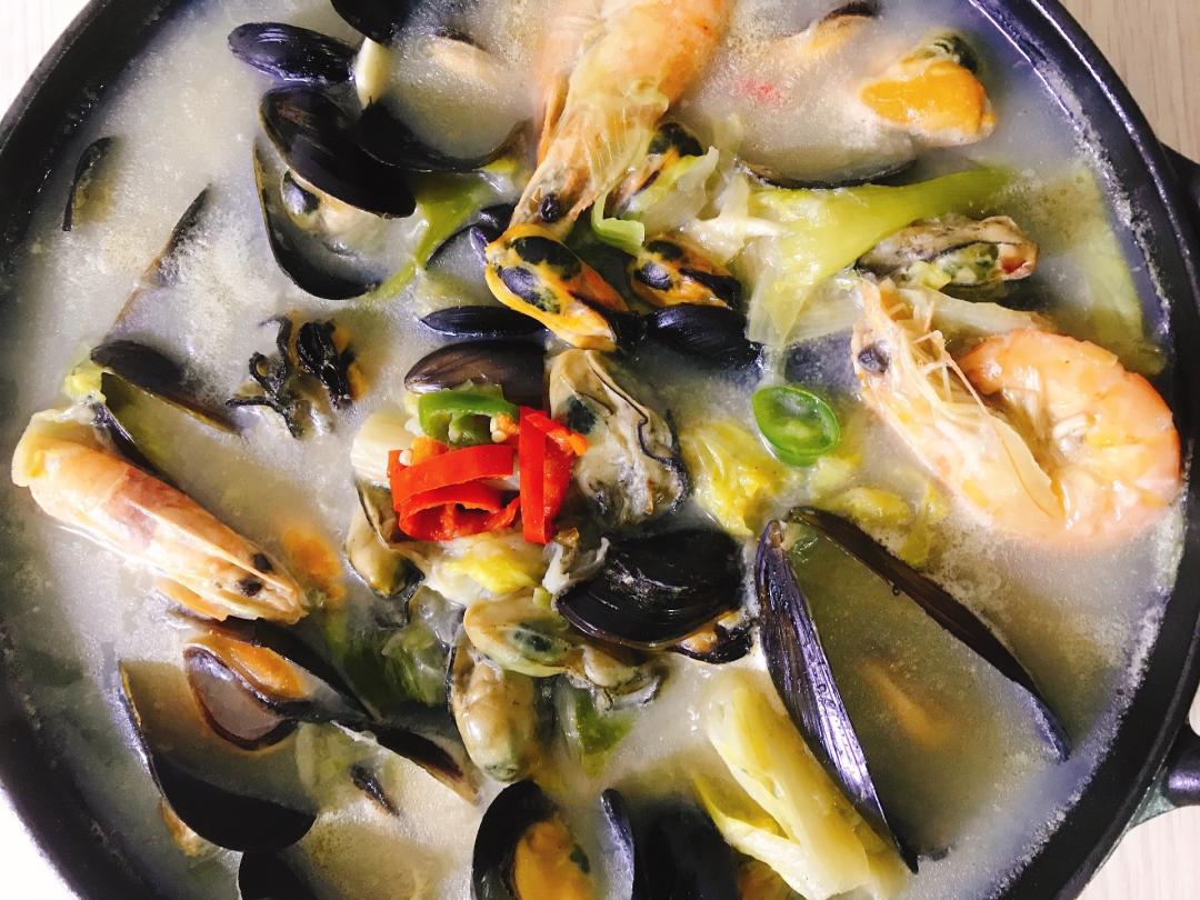 홍합만 한팩 사와서, 베이스로 진하게 국물 내주고, 냉동실에서 굴이랑 새우 꺼내서 넣고, 알배추만 넣어 끓였어요.