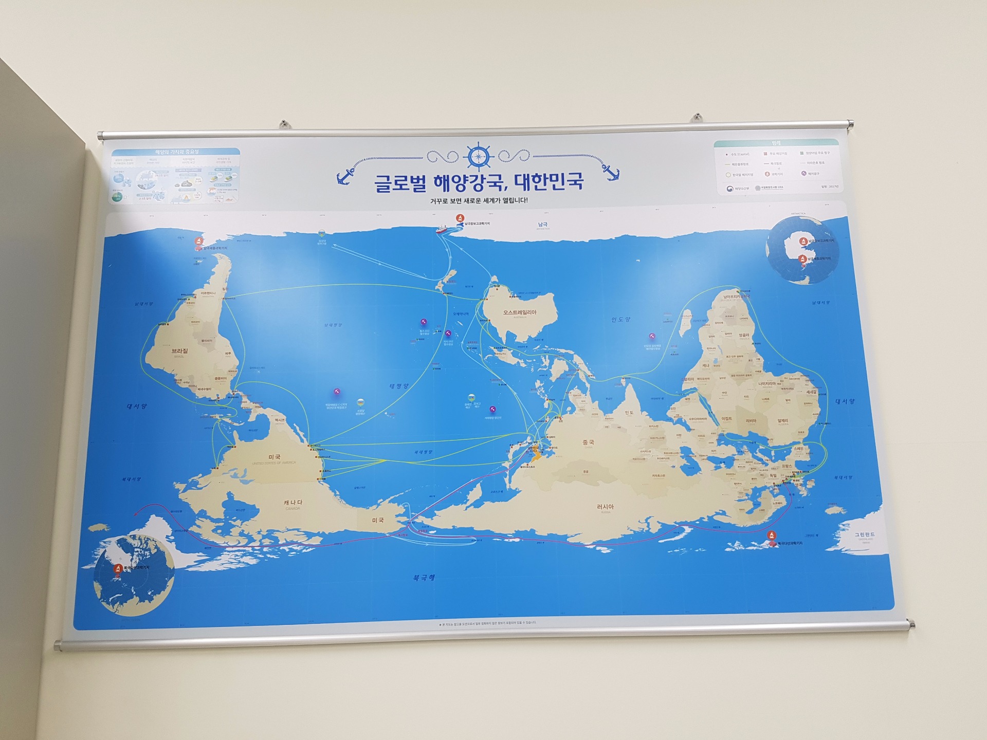 이번에 새로 제작한 거꾸로 세계지도에서는 이 부분을 보완하는 한편, 우리나라 해양진출의 성과물인 해운항로 개척, 원양어업기지, 극지항로, 남·북극 과학기지 등을 표기하여 전세계로 뻗어나가는 우리나라의 해양력을 한눈에 살필 수 있다.