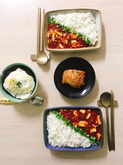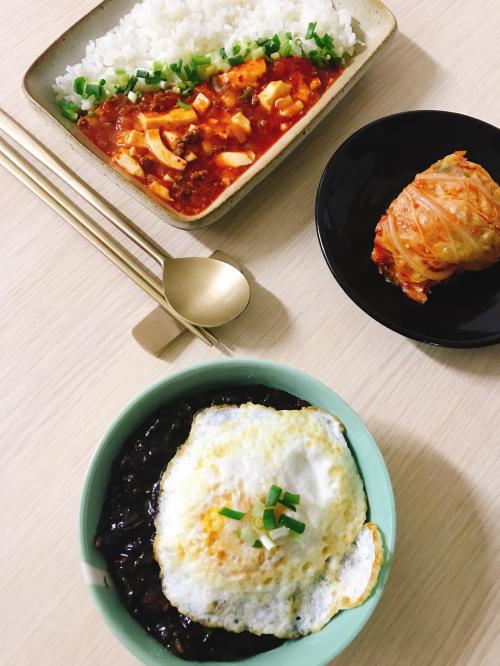 짜장, 마파두부와 밥 사이에 브로컬리를 이용하고 계라후라이를 더해서 시각적인 효과가 극대화 되었군요~^^