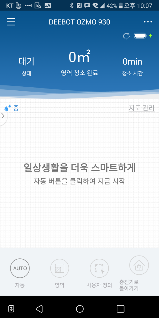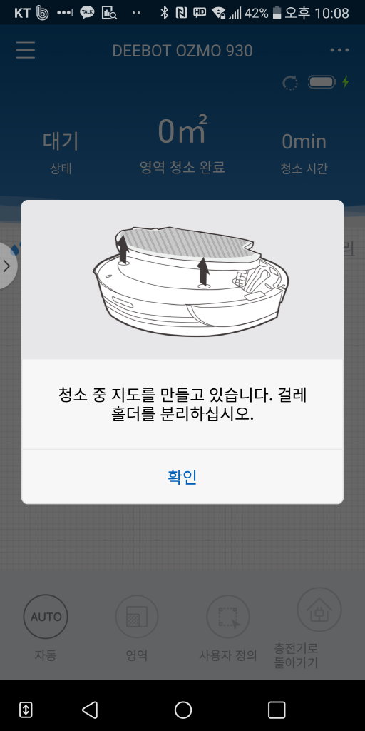 처음 구동할때 청소영역을 먼저 맵핑해야 한다고 친절하게 한글로 알려줍니다