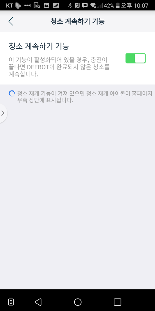 니토의 경우 청소중 배터리가 모자르면 충전 스테이션 복귀후 어느정도 배터리가 충전이 되면
