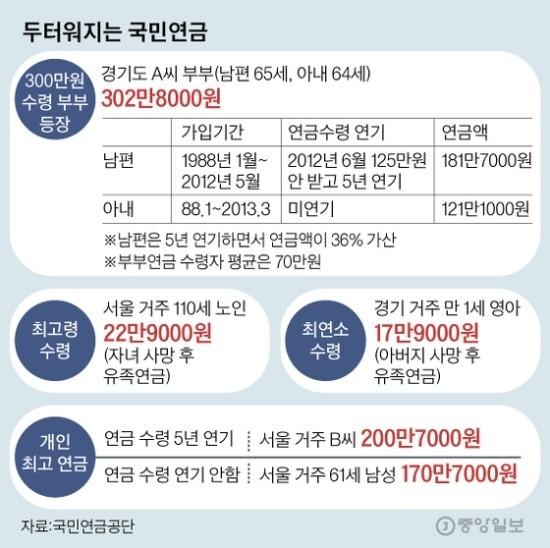 8. 국민연금 개인 최고액 수령자 → 200만 7000원. 최고령 수령자 110세. 전체 수급자 447만명 중 월 100만원 이상은 17만명. 전체 수급자 평균 36만원.(중앙 외)▼