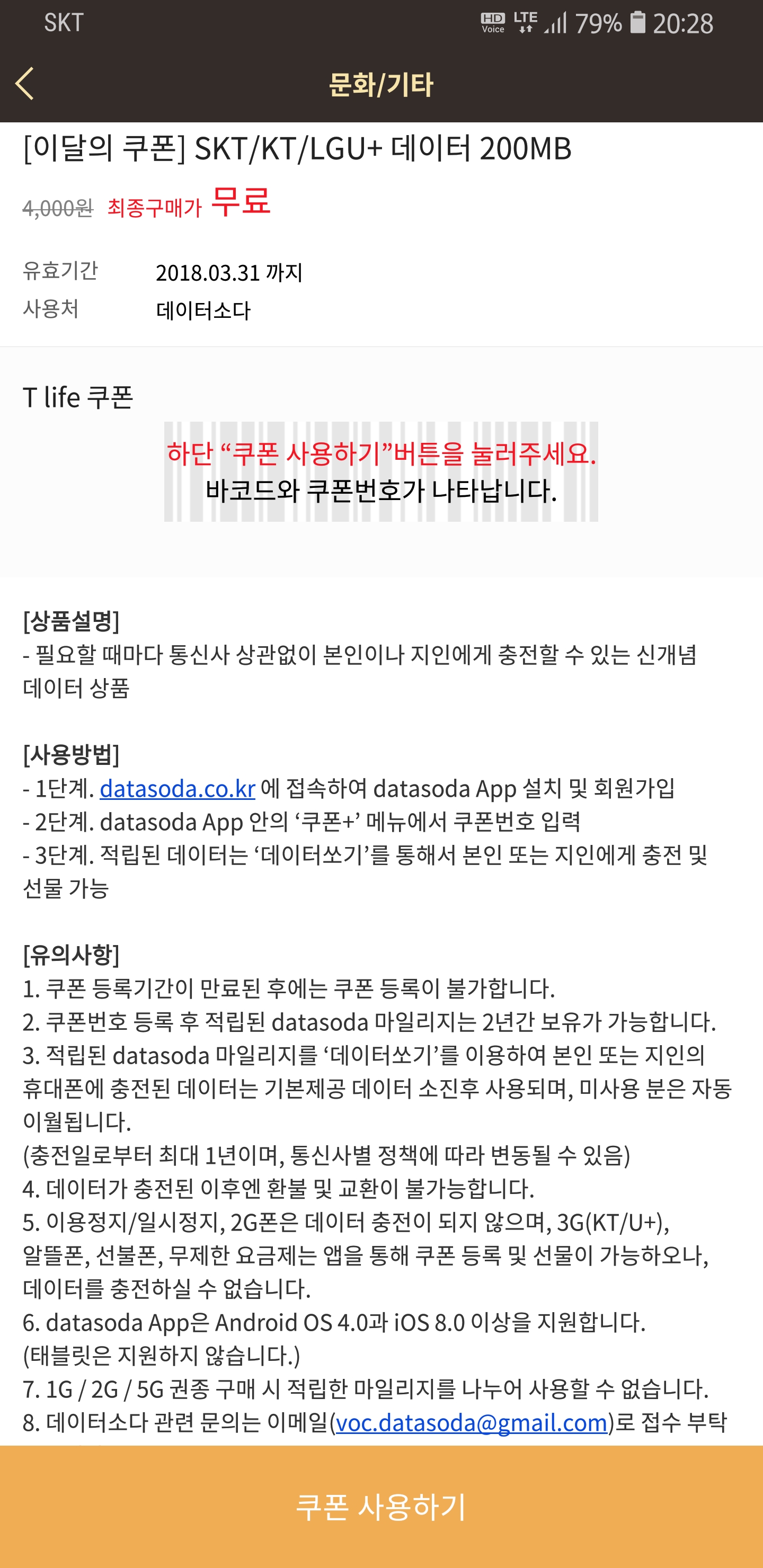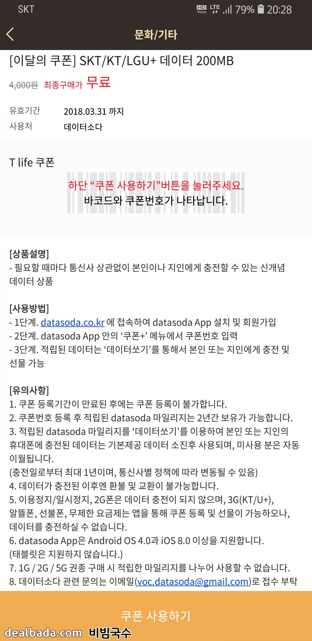 데이터 무제한 요금제 사용중이라 쓸모가 없습니다.