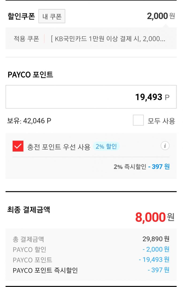 굳이 카드결제 만원까지 안해도 되고 8천원만 카드결제하고 포인트로 19900원까지 사용되네요 좀전에 결제한거랑 397원 추가할인 ㅋ