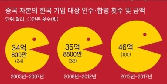 ​5. 중국 기업의 한국 기업 인수 합병 횟수 및 금액 → 2013년 ~ 2017년 5년 동안 100회, 46억 달러 규모. 주주자본주의 질서 부족, 회계·공시 규정 무시 사례 빈발.(중앙)▼