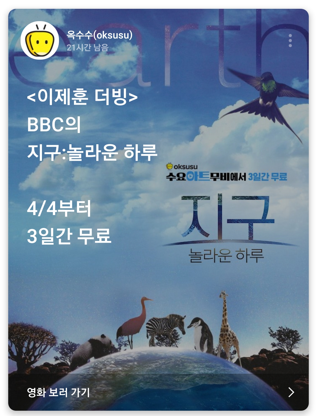 옥수수에서 영화 <지구: 놀라운 하루> 4/7 오전9시까지 무료로 볼 수 있어요