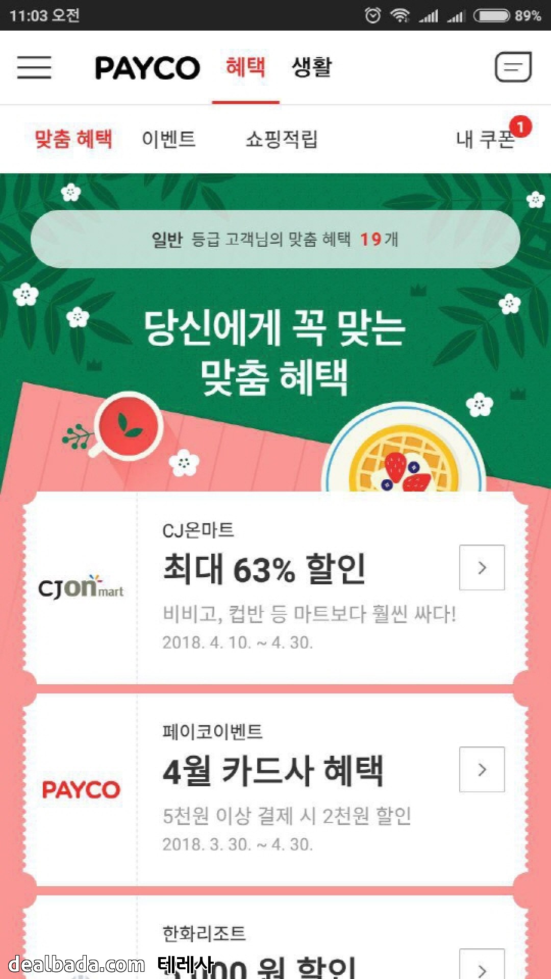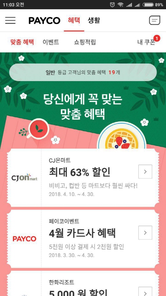 저도 제껀 쿠폰 받아지는데, 가족껀 이벤트란에 안나오네요.