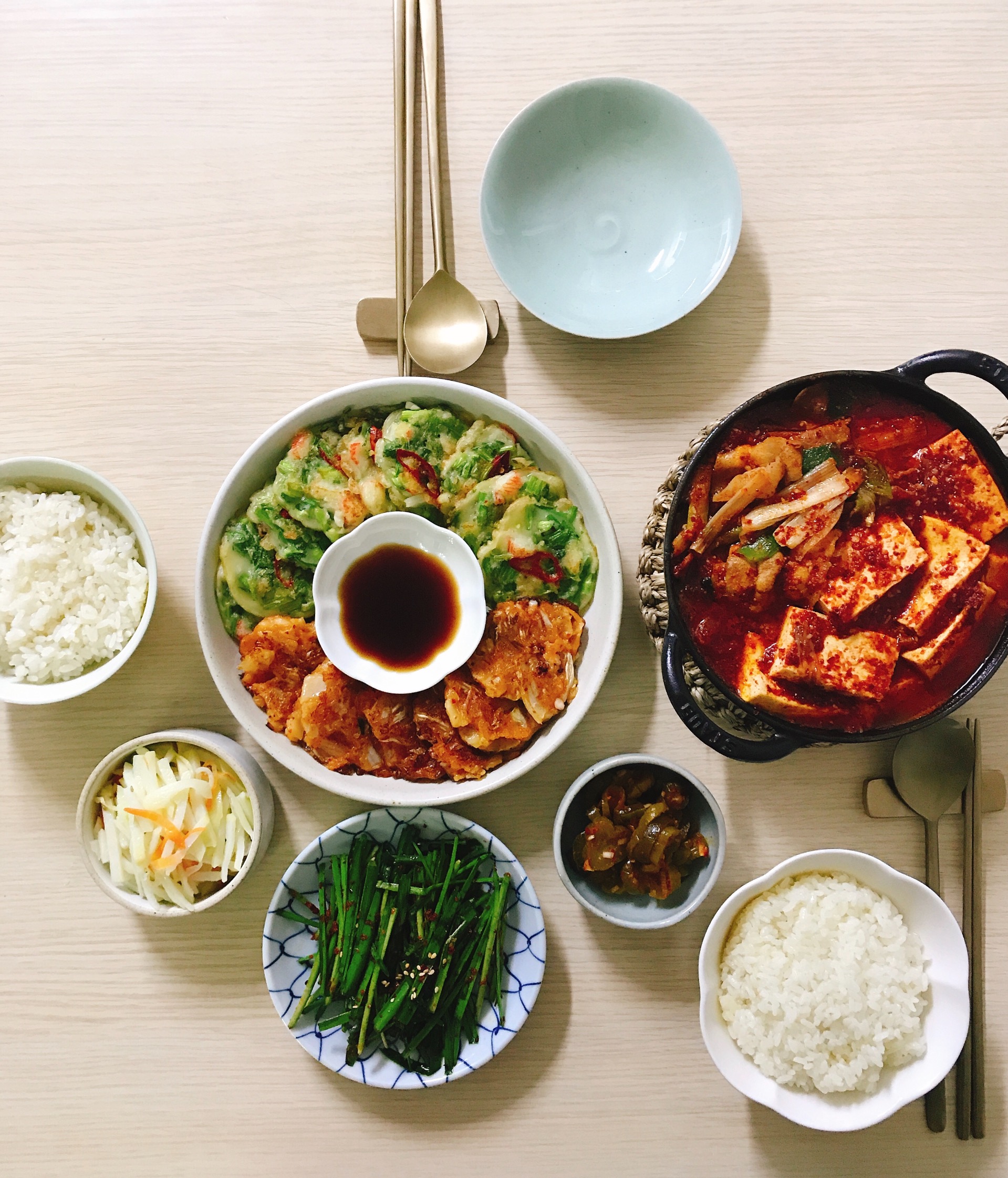 전과 부추무침의 색깔과 먹음직스러운 두부짜글이가 식욕을 돋게 해주네요.