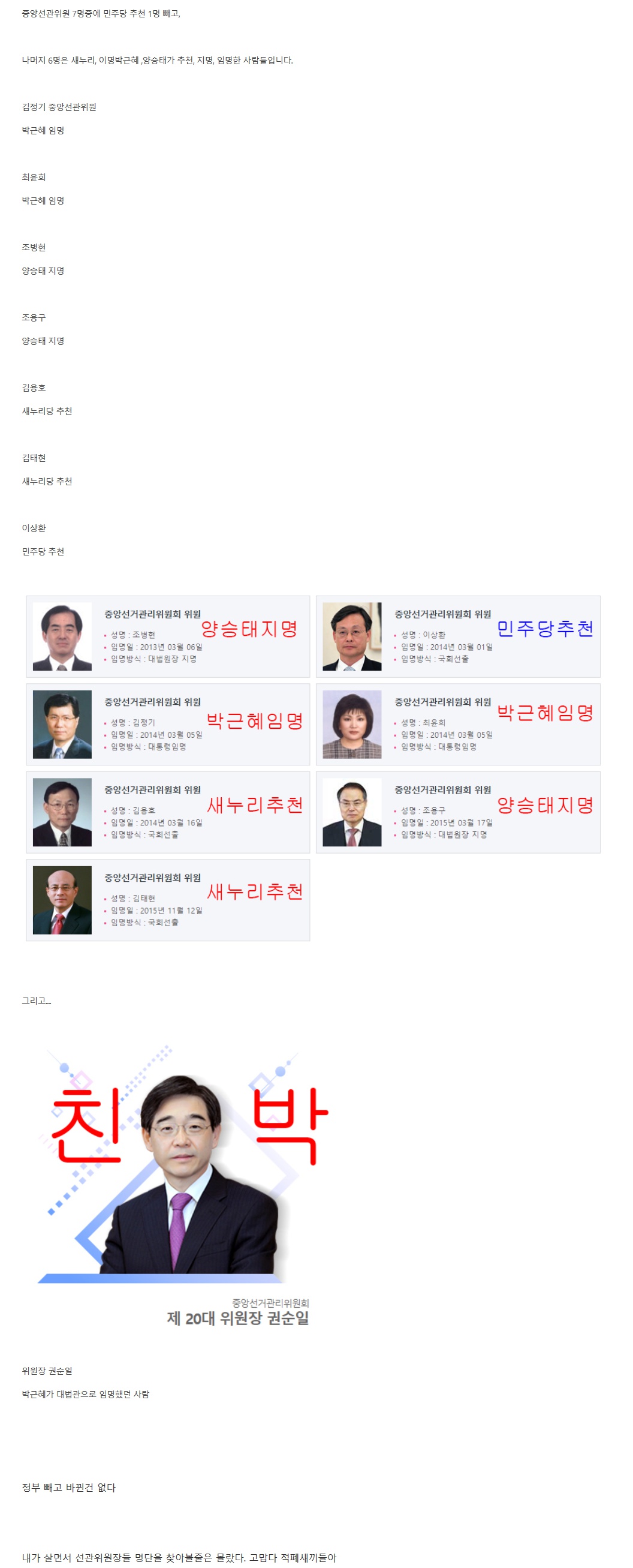 게다가 임명직이니 건드릴수도 없는데 굳이 선관위가 자한당편이라고 우르르 할 필요가 있나요?