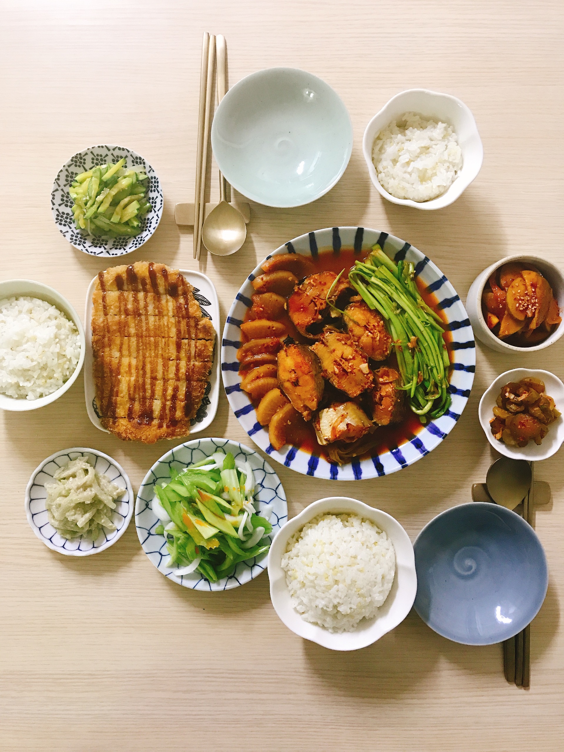 코다리 한 입, 돈가스 한 입, 샐러리 한 입, 호박과 무나물 한 입.
