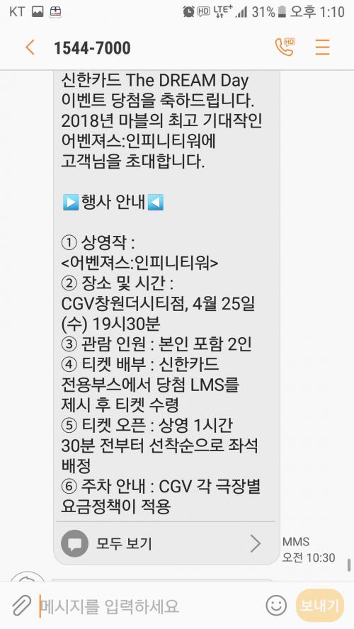 지난번 신청한 어벤져스:인피니티워 당첨되었네요ㅎㅎ