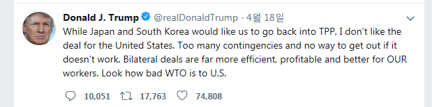 하지만 일본은 TPP에 목숨 걸만해요. 오바마 행정부 시절 엄청나게 공들이고 투자한게 많은데 트럼프는 일축!!!