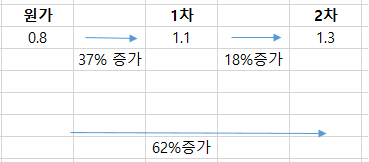 37%는 원가에 대한 증가분이고 18%는 1차에 대한 증가분이니까 당연히 둘이 더하면 안되는거죠.. |