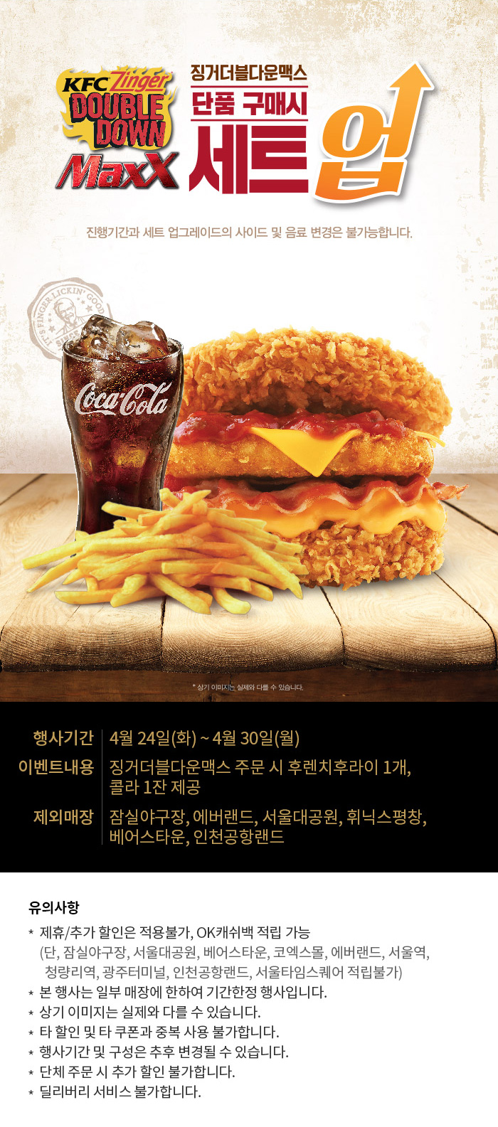 kfc에서 징거다운맥스 단품 6천원사면 셋트업해주는 행사 이달말까지하는데