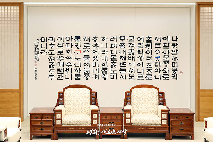 문 대통령의 ‘ㅁ’이 포함돼 있는 부분은 ‘서로 맞다’ ‘통하다’라는 뜻이며, 김 위원장의 ‘ㄱ’이 있는 부분은 ‘만들다’라는 뜻을 담고 있다. 김 작가는 두 문장을 합쳐 ‘서로 통하게 만들다’라는 새로운 의미를 부여했다....