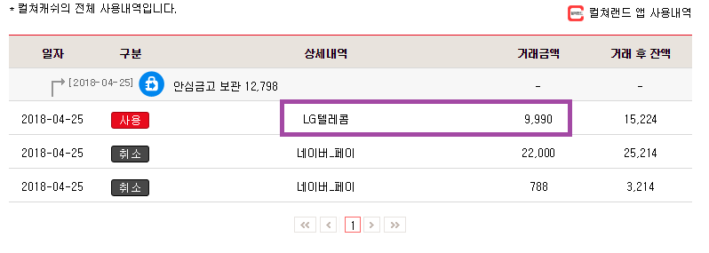 원래 네이버에 충전하든 취소하든 그냥 '네이버페이'로 찍혔었는데 알 수 없는 LG텔레콤으로 내역이 떠서 놀랐었습니다.