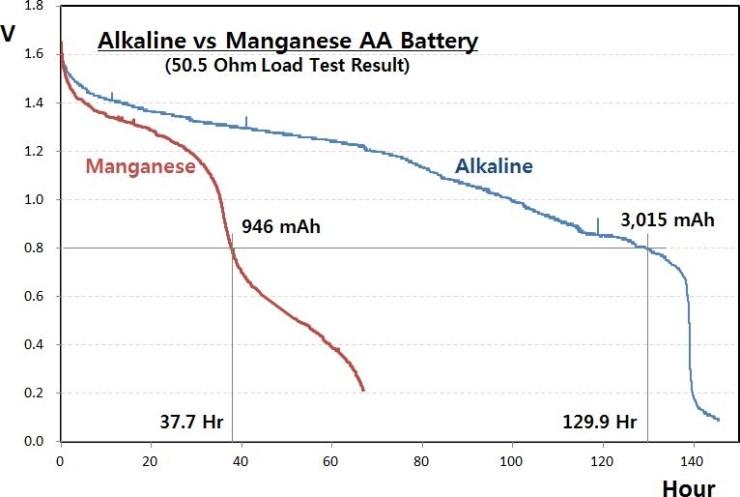 저게 3.34 옴인가 주는 조건이고 망간이 38시간 알칼라인이 130시간 버티는군요 ( 사용시간 )