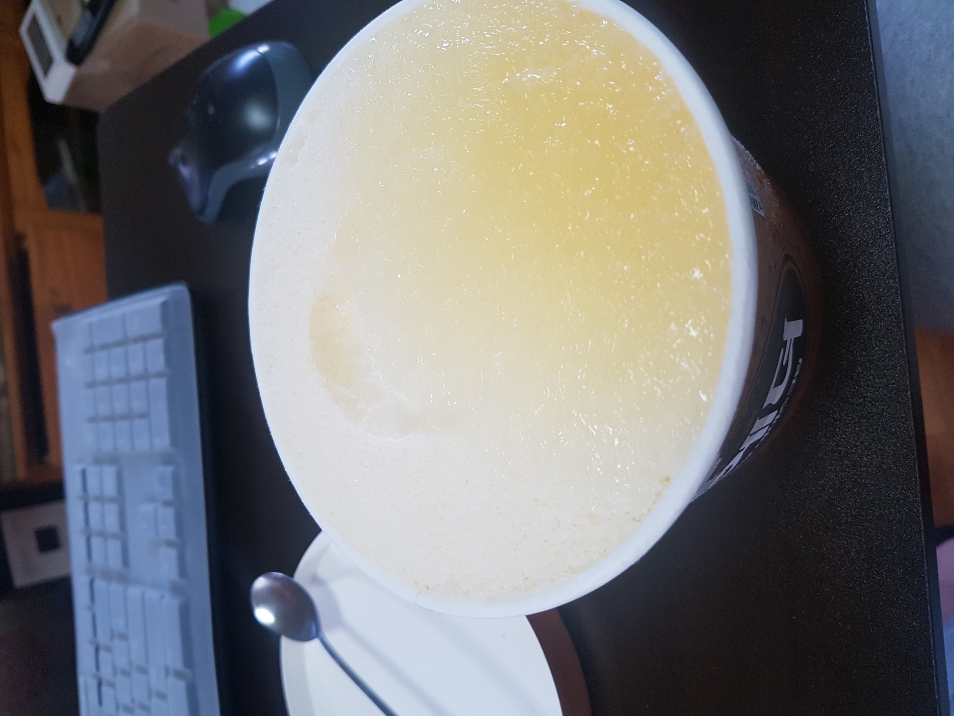 아이스크림 핫딜 올라왔을 때 구입했는데 드라이아이스가 안보이더니 제품 포장 벗긴 것마다 저런 노란색이어서 환불했었어요. 녹았다가 다시 얼면 저렇게 될겁니다.