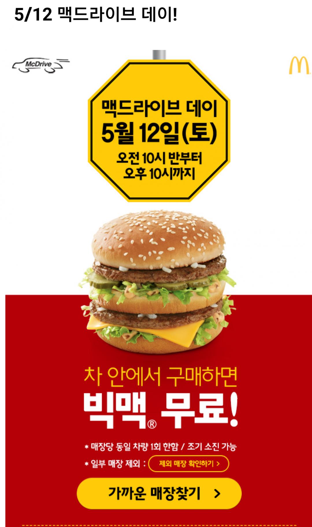 5/12 맥드라이브 데이 빅맥 무료(조기소진가능)