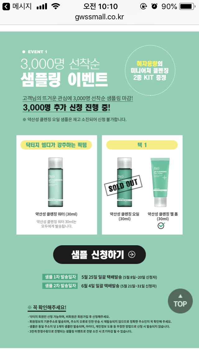 닥터지 가입되어 있으신분들 무료샘플 신청하세요 클렌징 오일은 품절인거 같고 폼만 남아있네요 선착 3000명입니다
