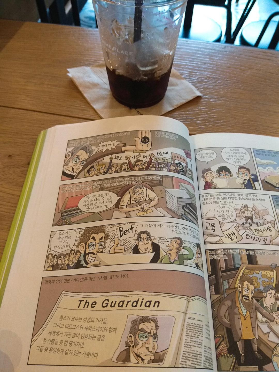 전 아침에 병원에서 결혼 격려를 받고 투썸에서 촘스키 만화책 보고 있습니다ㅋ