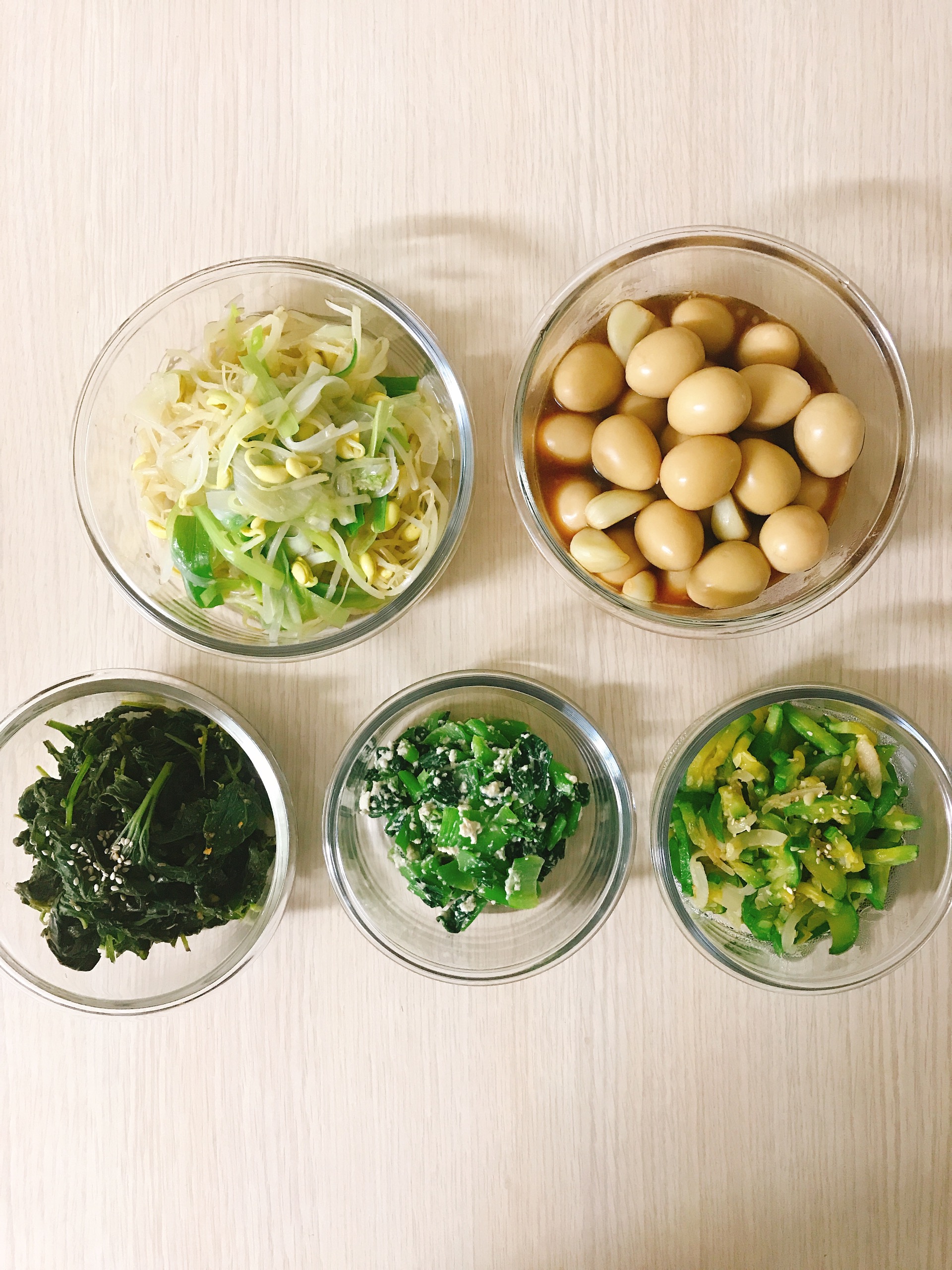 콩나물무침 과, 안 짠 메추리알조림, 취나물된장무침 과, 청경채두부버무리, 애호박나물 까지.
