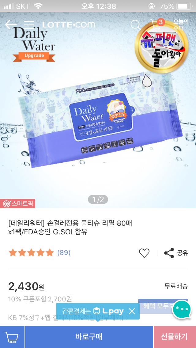 2,430원 물티슈 무료배송 샀어요  L포인트 조금 보태서