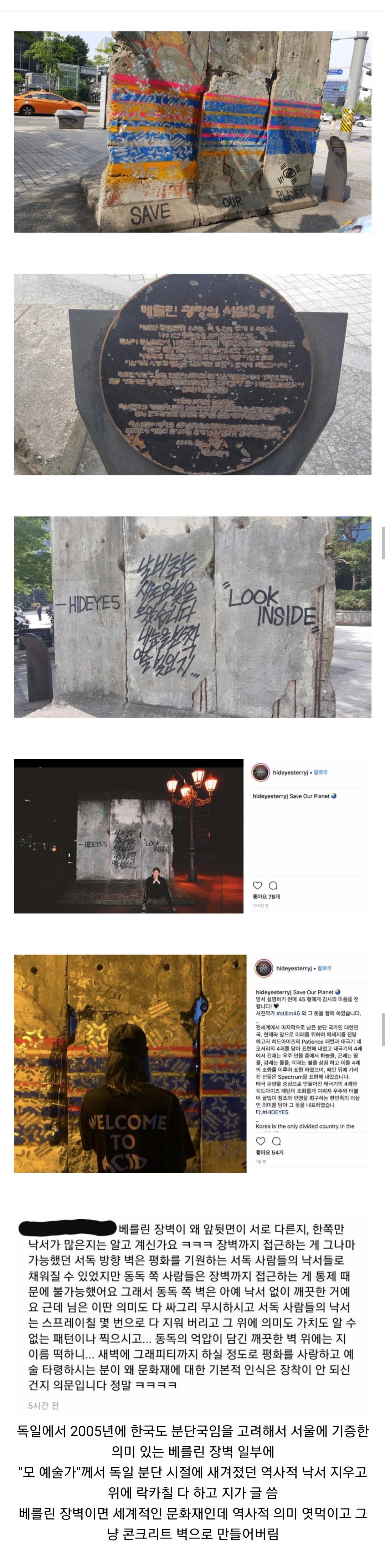 역사를 좋아하는 입장에서 너무 속상합니다. 독일 분단의 역사성과 문화재로서의 가치가 있는 서독측 벽면의 메시지들, 염원을 담은 글귀들을 싸그리 짓밟아버리고 동독측 벽면의 안타까운 깨끗함까지 모조리 뭉개서 자기 멋대로 겉멋만 든 낙서로 문화재를 훼손한 무식한 반달리즘의 전형입니다. 엄정한 처벌이 필요합니다. |