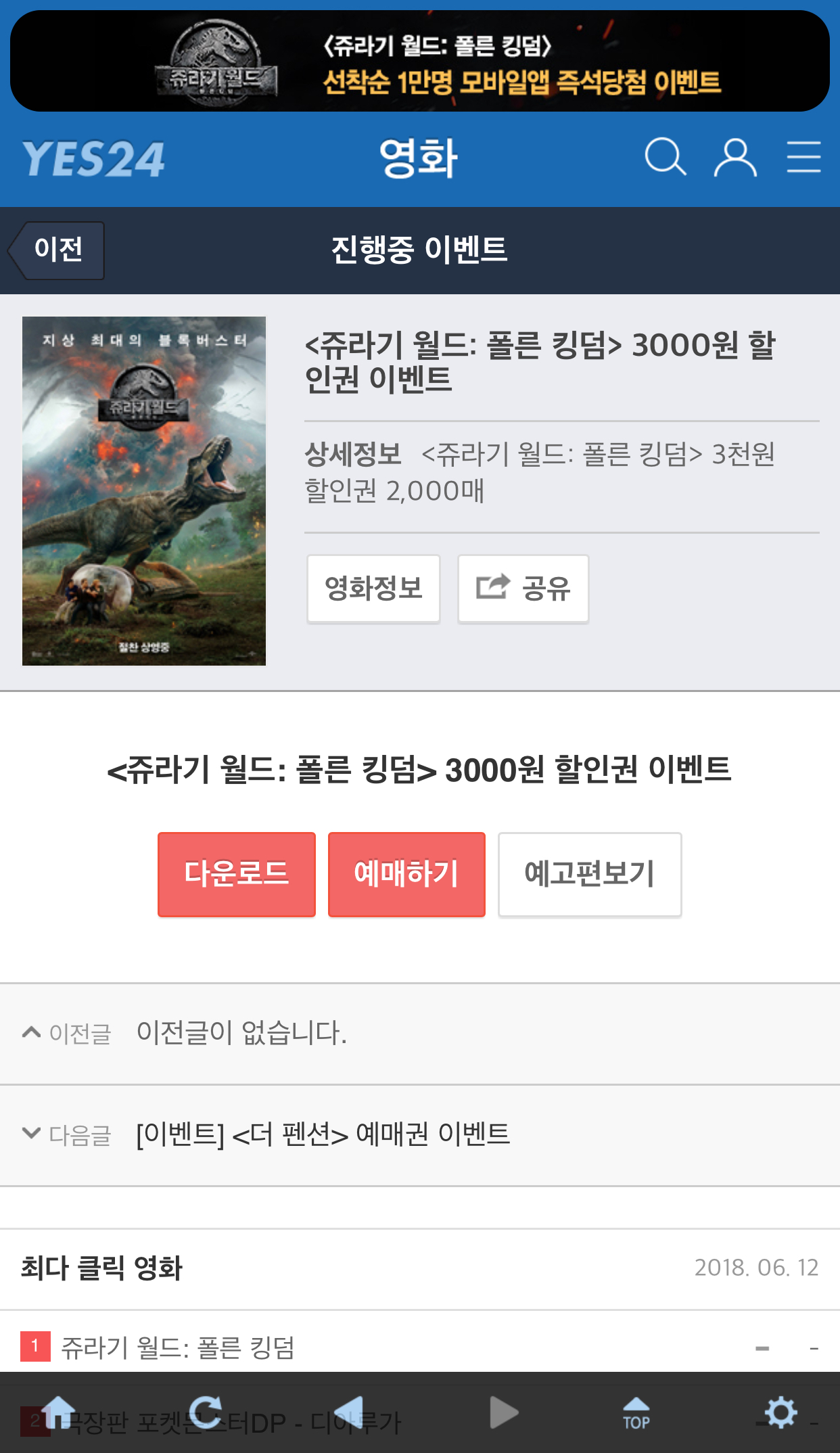 예스24 영화 쥬라기월드2 폴른킹덤 3,000원할인권 선착순