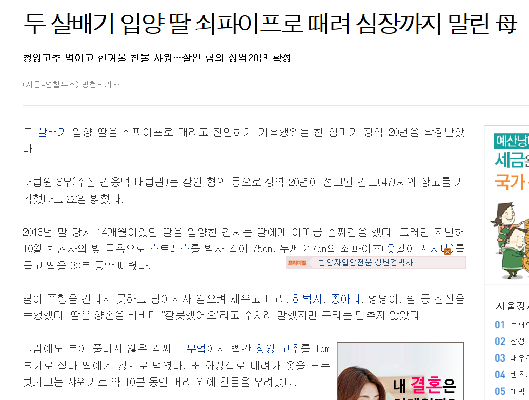미친 개XX 아~~놔 두아이 키우는 부모로서 진짜 열받네요 20년이 아닌 무기징형 아님 똑같이 사형해야되는거 아닌가요? | ||