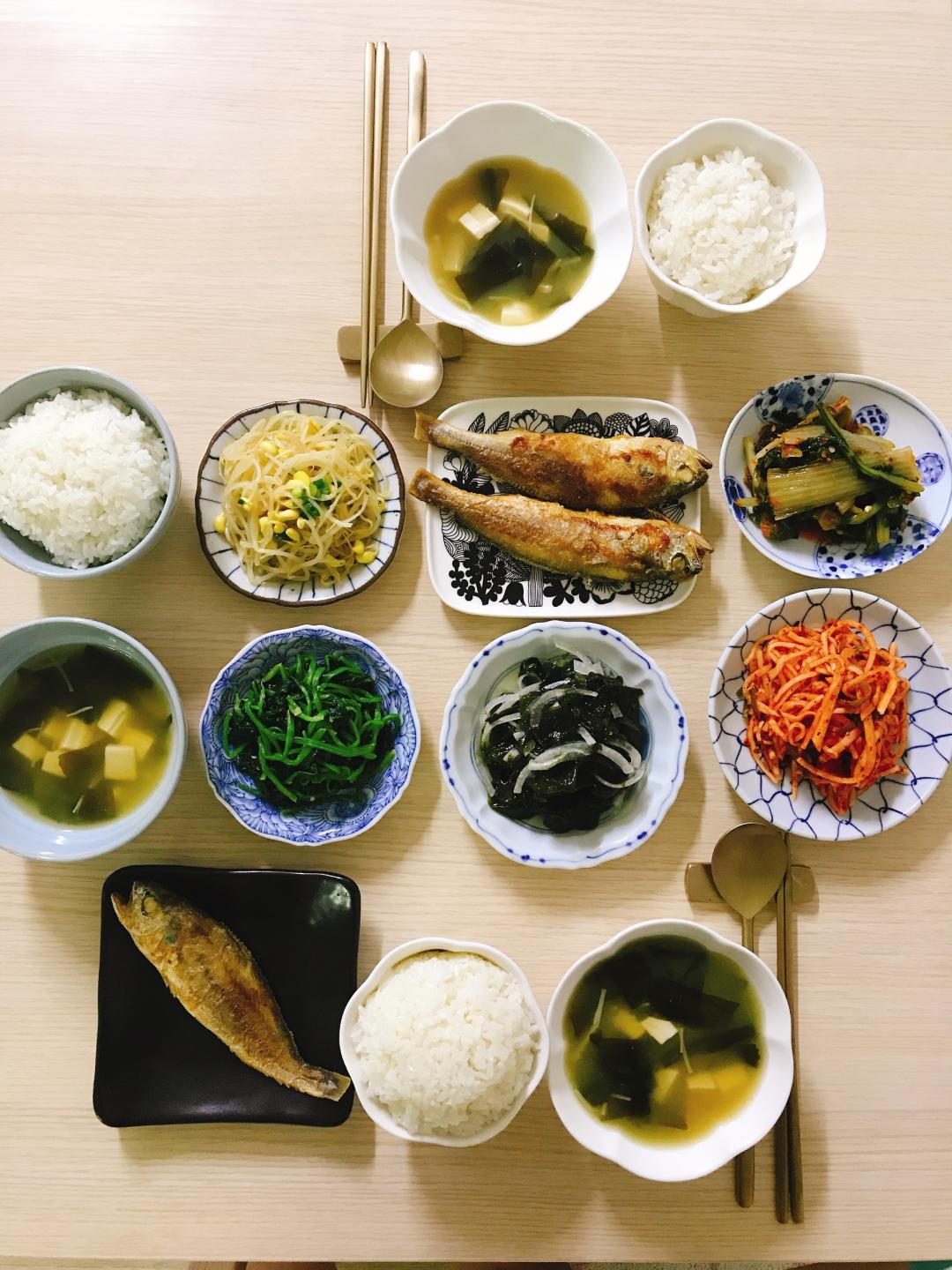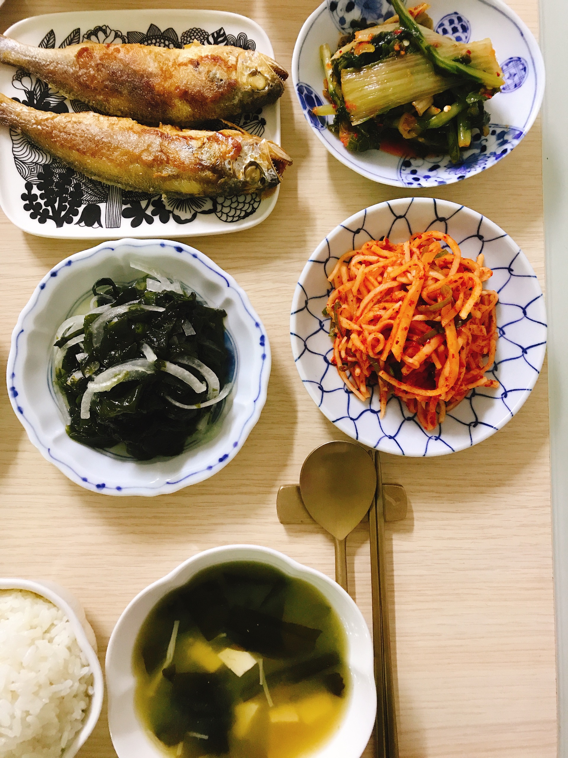 미소된장국 과, 굴비구이, 무생채, 미역초무침, 콩나물무침, 시금치나물 준비했어요.