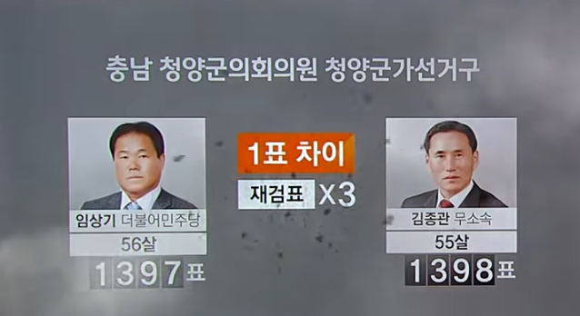 같은표일경우 나이가 많은쪽이 당선된것으로 한다는 규칙에 의해 당선자가 뒤 바뀜.