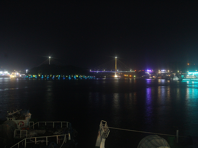 항구에서는 조명이 현란한 유람선이 떠다니고