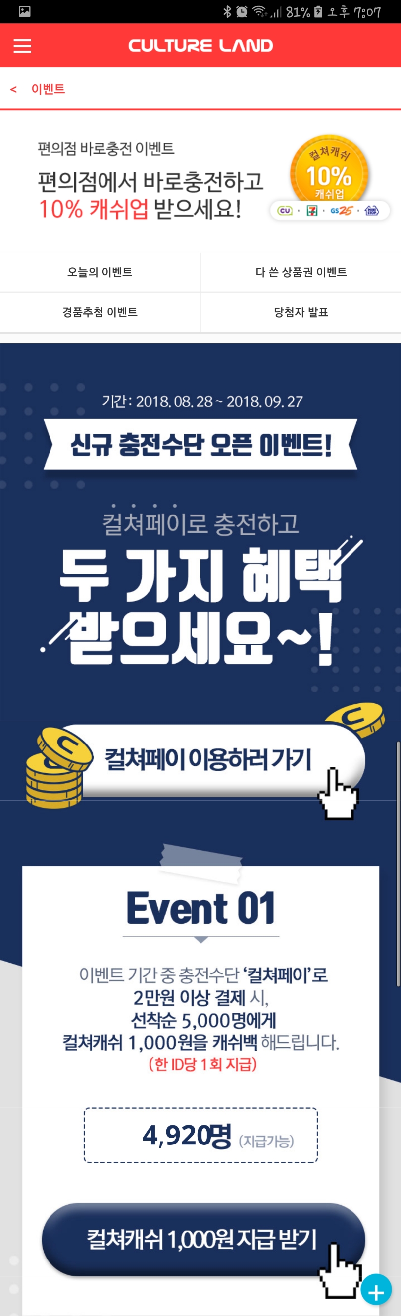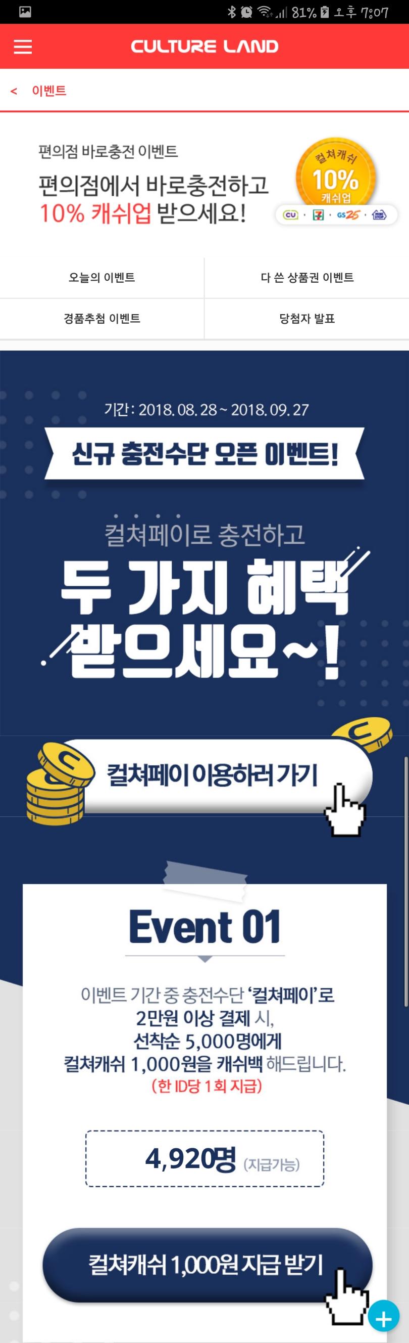 8월28일부터 2만원 이상 컬쳐페이로 충전시 5천명 한정 1,000원 지급에 1만원당 3% 추가충전까지 해서 약 8% 캐쉬업 효과 있어요.