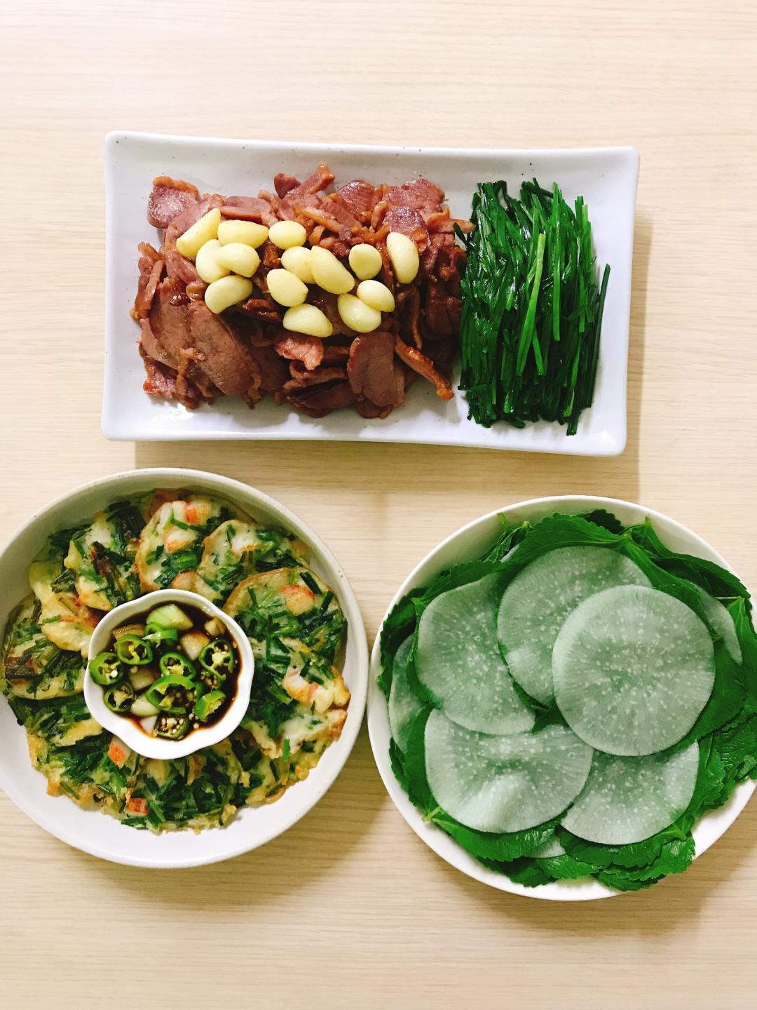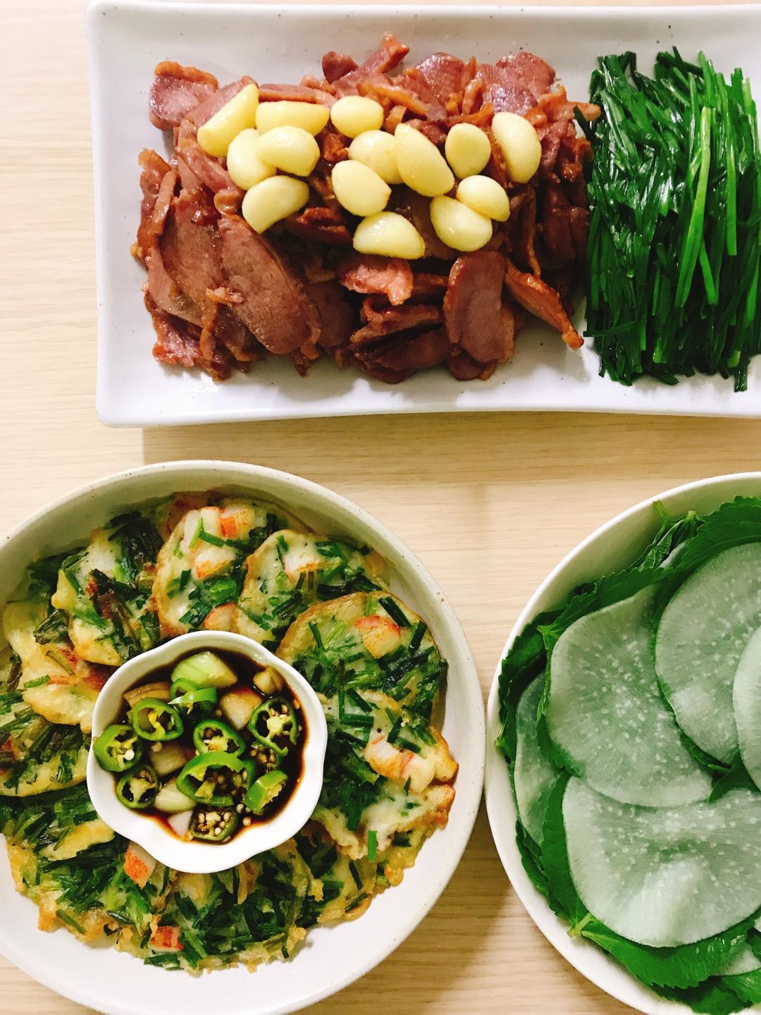 훈제오리 굽고, 부추전 만들었어요.