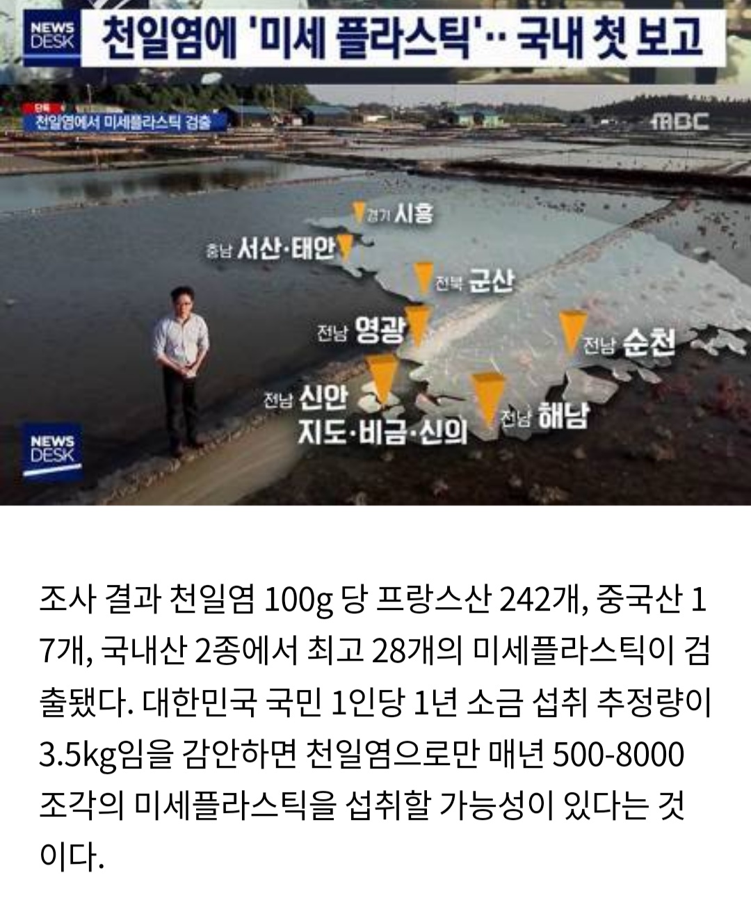 결국 국내 소비되는 천일염에서 미세플라스틱이 검출되었다네요.