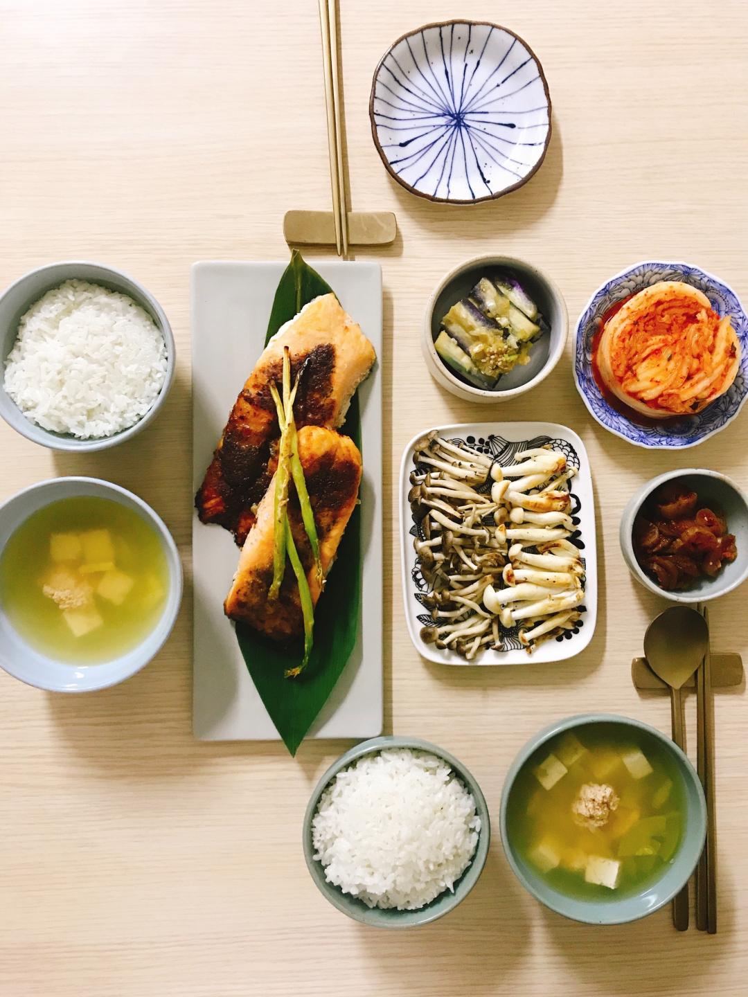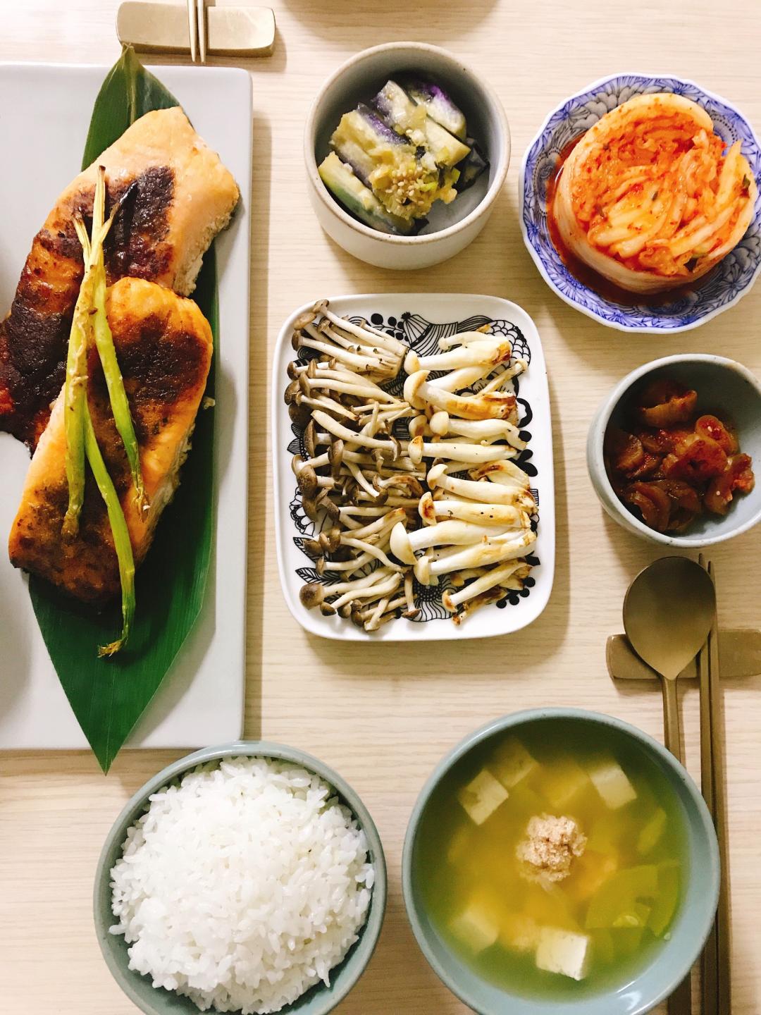 메뉴는, 명란젓국 과, 연어스테이크, 버섯만 구워 냈어요.