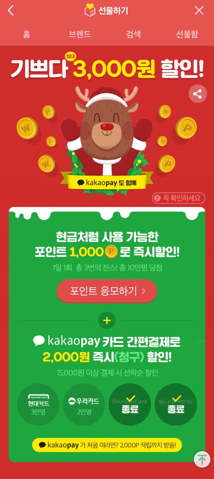 선물/쇼핑 메인화면에서 보이는 크리스마스 혜택 배너 들어가서 응모해보세요