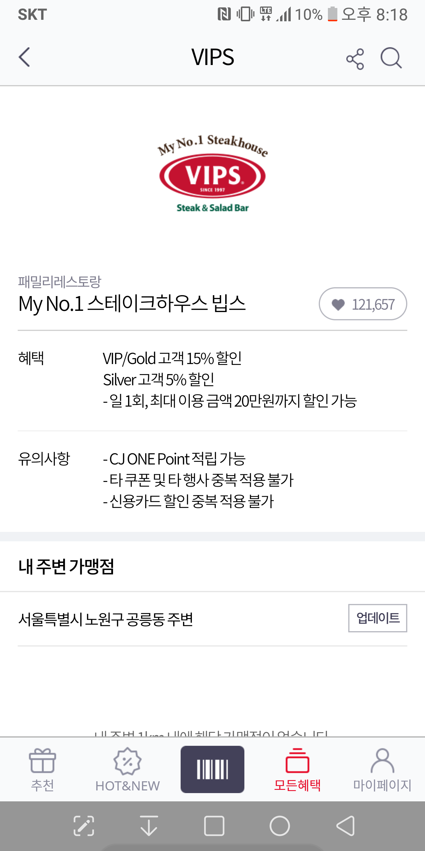 이달에 딸래미 둘이 생일이라서 일요일 저녁에 VIPS 가려고 하는데 SKT 멤버쉽 할인이 15%네요..