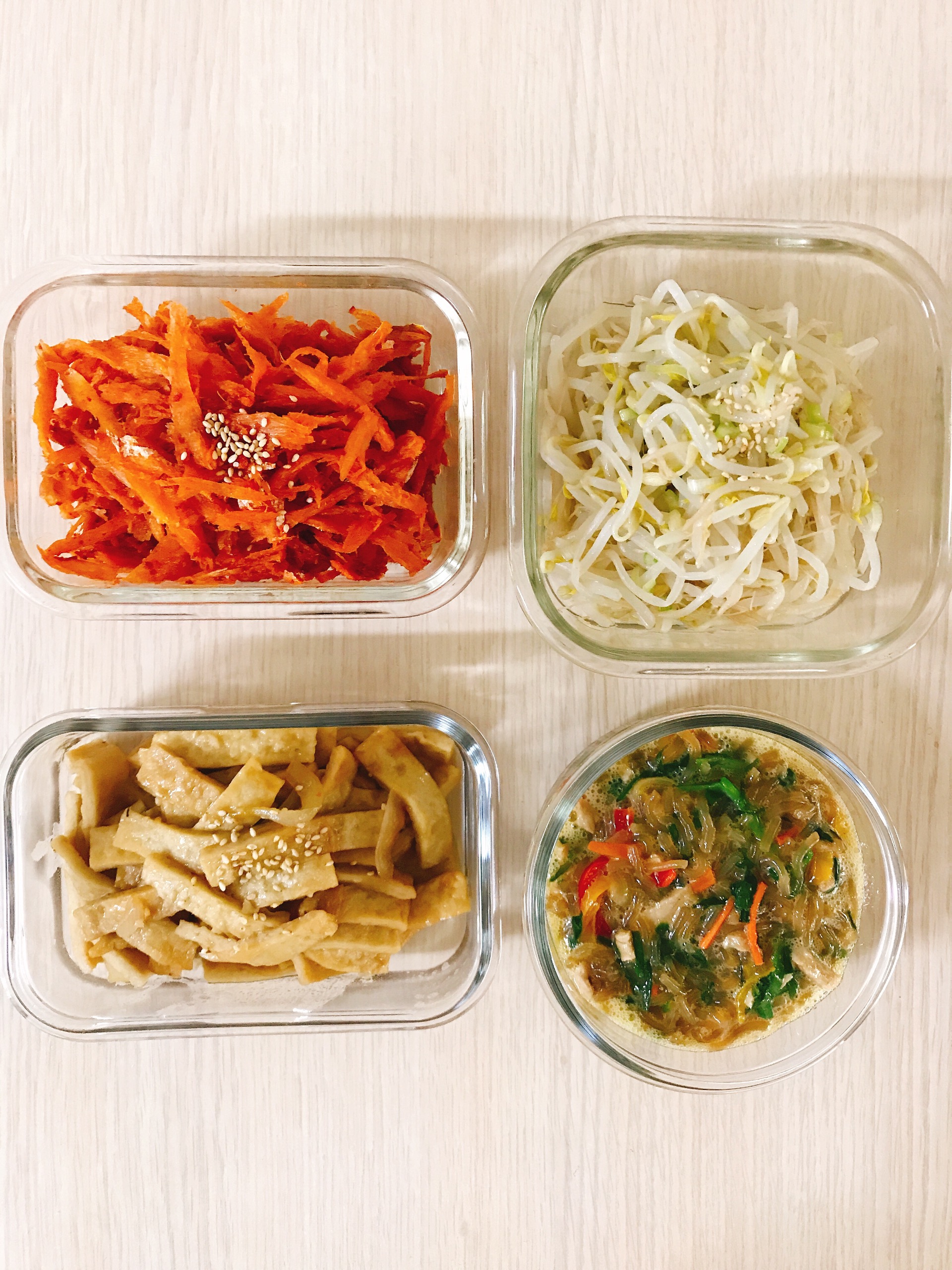 황태무침, 어묵볶음, 숙주나물 준비하고,