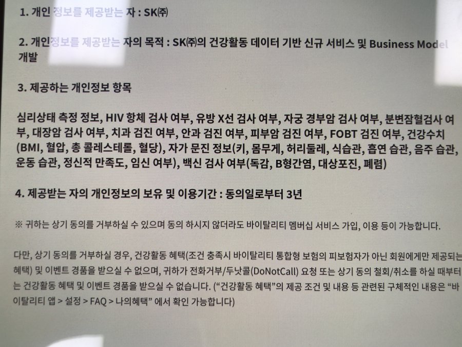 며칠전 자게글보고 T건강걷기란 이벤트에 대해서 알게되었는데 하루 만보이상 걷는 제게는 꿀 이벤트더군요 가입하려고 정보를 더 찾아봤는데 저런 정보까지 SKT에 3년간 넘겨주고 한달에 12000원 통신비 할인이라니 고민이 되네요.. 통신사는 저런 정보를 받아다 뭘 개발한다는 것인지.. 찝찝한 이벤트네요
