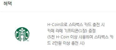 - 스타벅스 카드 2만원이상 충전할때 5000 코인 사용하면 카페라떼 증정