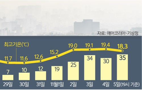 2. 예년보다 빨리 온 '삼한사미' → 겨울철 추위 오면 미세먼지 반짝 개선, 중국발 이동성 고기압 영향으로 날 풀리면 다시 악화 되는 현상. 10월 중순부터 뚜렷. 5일도 전국이 PM 2.5 나쁨.(세계)▼
