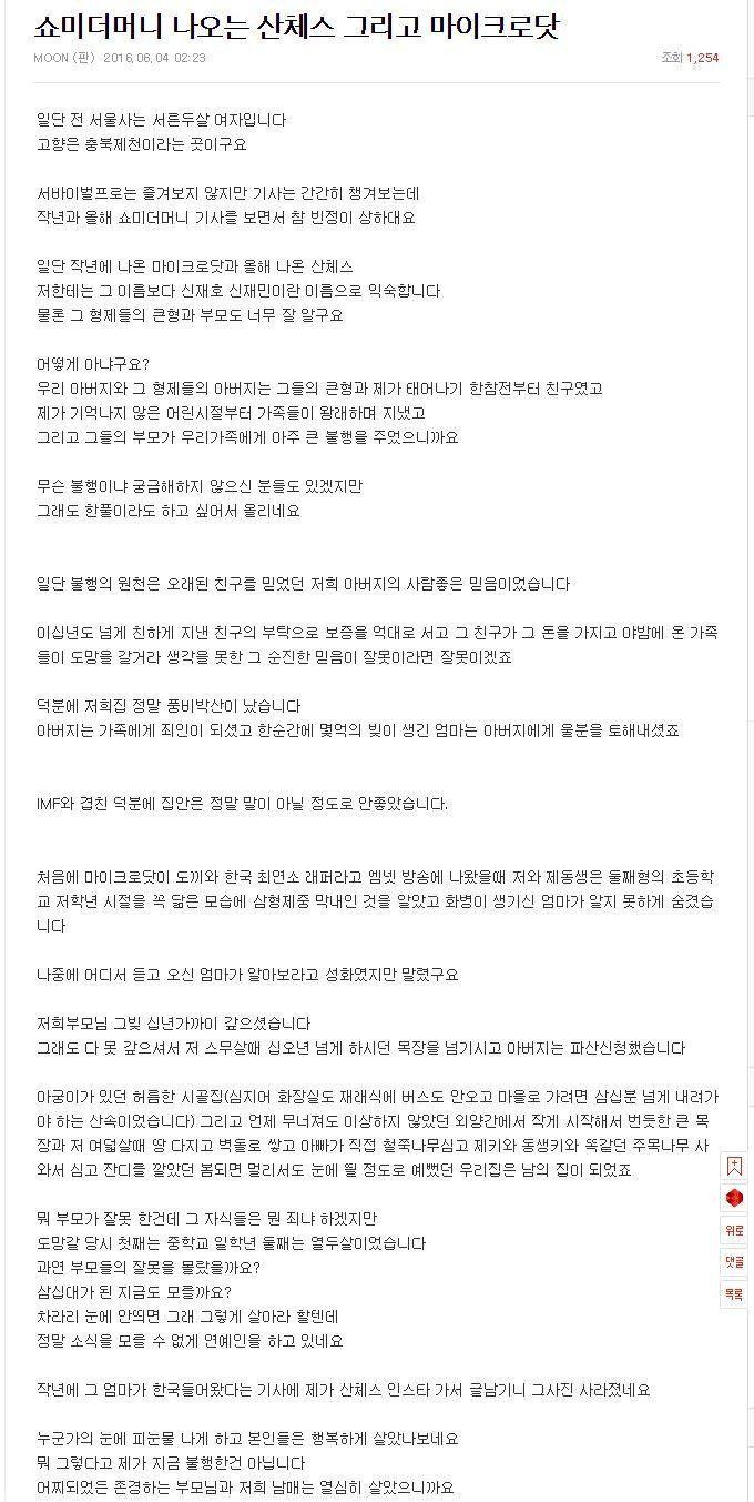 작년에 이 글이 스물스물 올라왔을때 네이트판이 아닌 다른커뮤니티 게시판에서 봤습니다. 그때는 완전 뜨기전이어서 크게 화제가 안되었지만 당사자도 분명 소식을 봤을테지만 법적조치없이 무시전략을 하기에 루머가 사실일것 같은 예감이 들었습니다. 사기를 친 사람은 그 기억을 잊겠지만 사기당한 사람은 당시 상황 하나하나를 생생히 기억해서 평생을 안고 살아가기에 구체적이고 사실적인 묘사의 글이 신뢰감을 더 높였습니다.. |