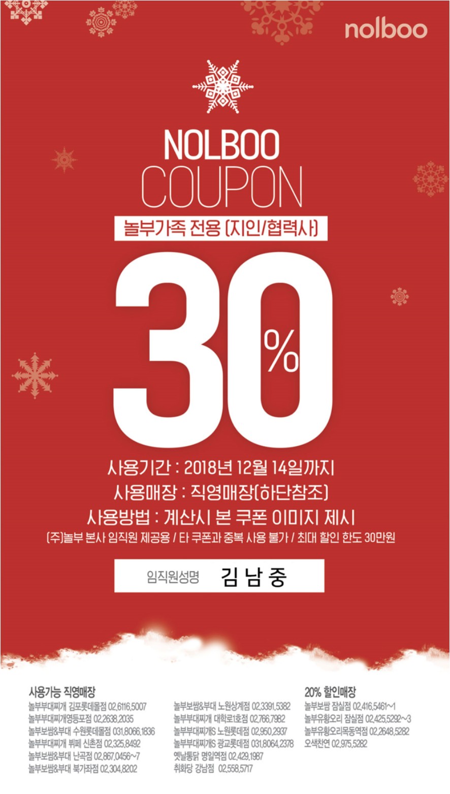 놀부부대찌개 직영점 30%할인 쿠폰 필요하신분 받으세요