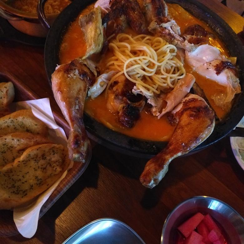 메뉴는 퐁듀통닭인데 부드러운 치즈와 스파게티 그 위에 구운 통닭이 나옵니다.